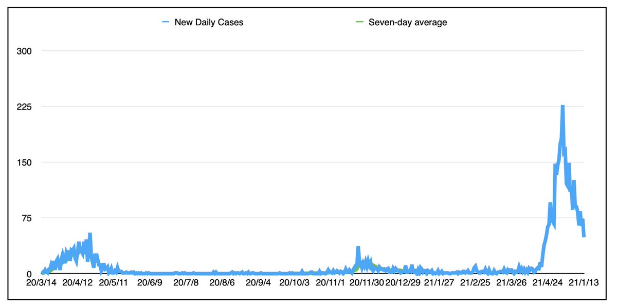 Here is the graph of daily new cases and the 7-day rolling average (today at 73) since March 28, the last day of zero new cases: