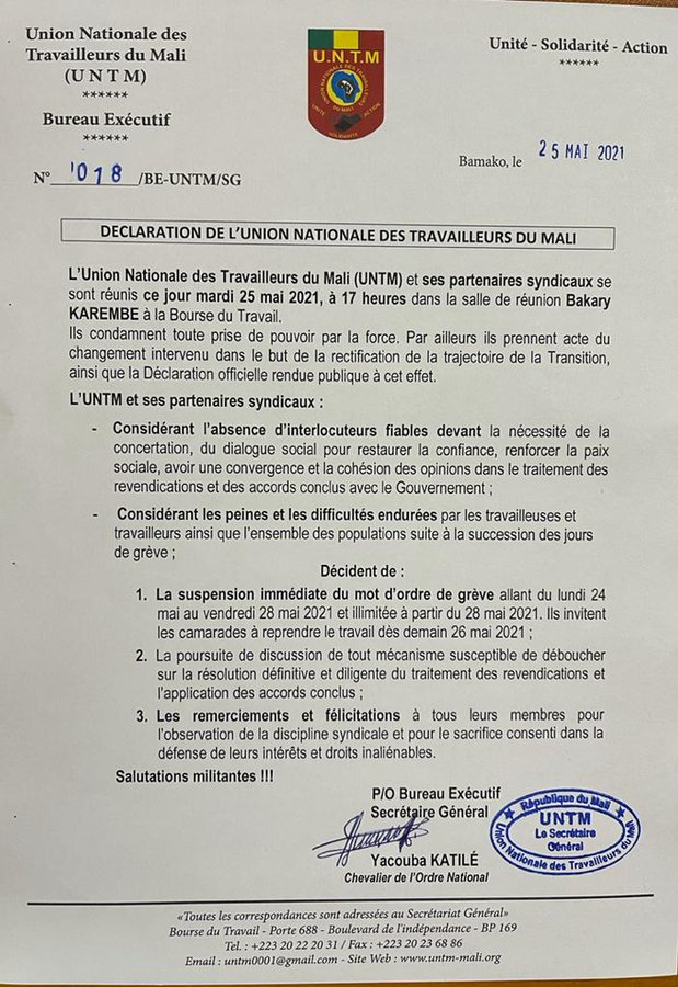🇲🇱 El sindicato de trabajadores más grande de Malí anuncia la suspensión de la huelga que estaba programada hasta el día 28 de mayo debido a la situación en el Gobierno.