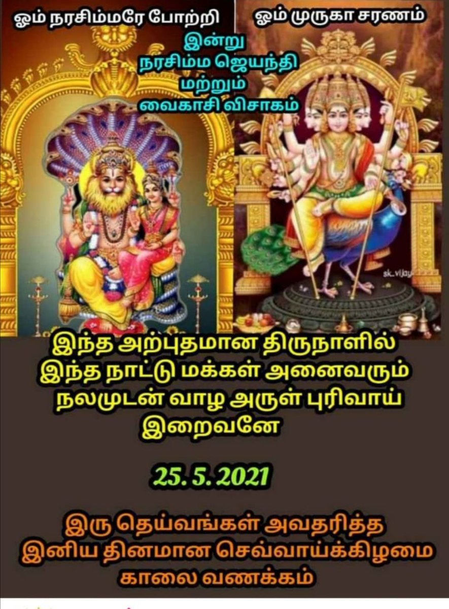 25-05-2021 செவ்வாய் கிழமை இன்று நரசிம்ம ஜெயந்தியும் முருகப்பெருமானின் அவதார தினமான வைகாசி விசாகமும் சேர்ந்து வந்துள்ளது. கொரோனாவை விரட்ட பிரார்த்தனை செய்ய உகந்த நாள்.