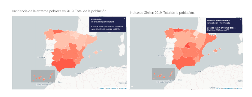 El nuevo observatorio ofrece información anual detallada y actualizada sobre los principales indicadores de pobreza y desigualdad de ingresos en España y por comunidades autónomas, en forma de Mapa, Evolución o Infografía.