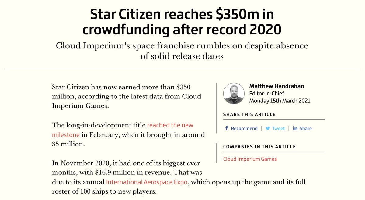 It has raised in excess of $400M over this time. Just over $350 via funding and the remainder via investment with sale of 10% of the company. Star Citizen has its fans. The people that are working on it. The people that see its potential and support it. The investors.