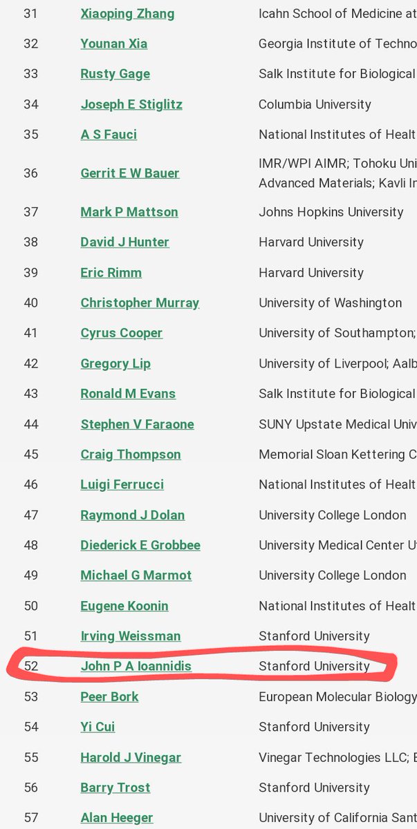 Ioannidis, The Great, head of METRIC, is the 52th scientist counting all disciplines in the h-index, made out from the number of citations and cited publications.