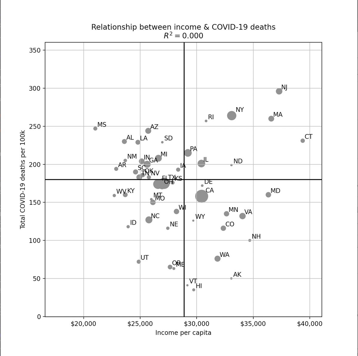 Even if you remove the Northeast states that were hard-hit early on in 2020 (NY, NJ, CT, MA), the correlation is still very weak.
