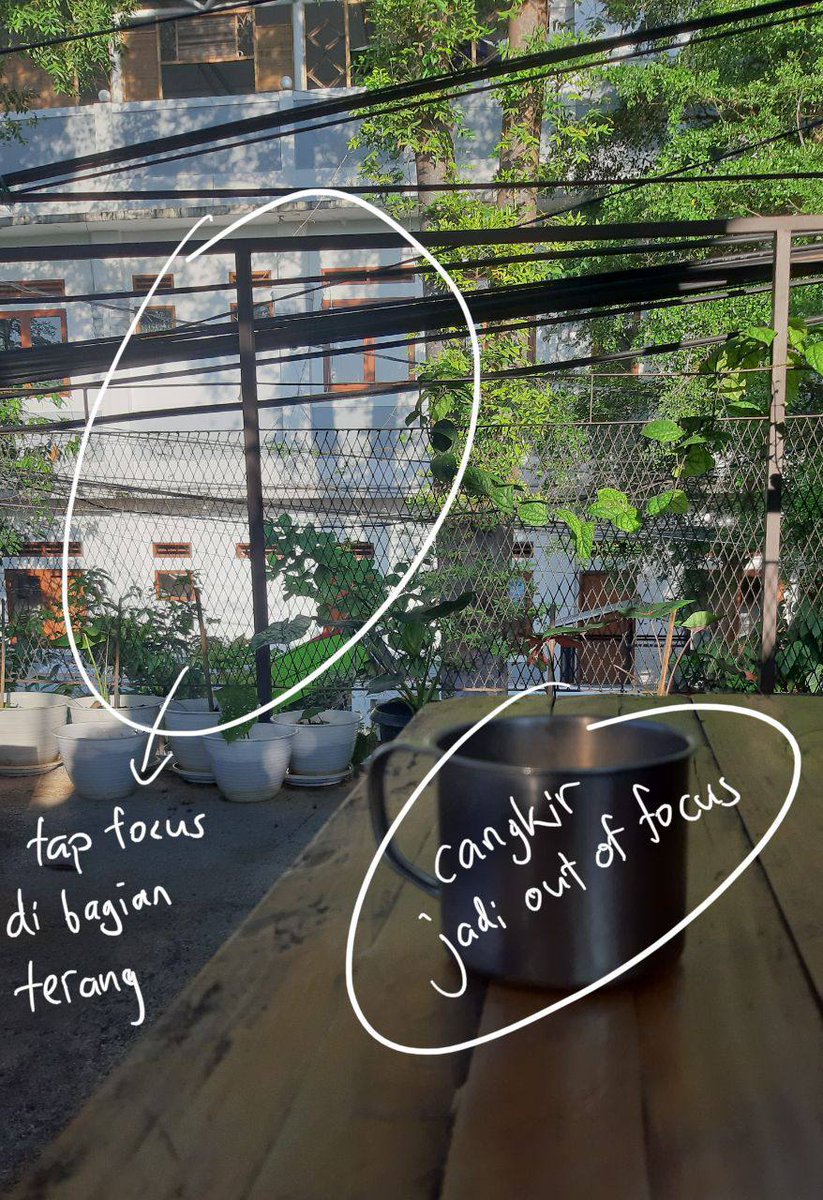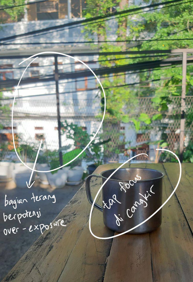 Kalo misalnya cuma tap di cangkir tapi ga atur exposure, bagian yang terang berpotensi over-exposed setelah diedit.