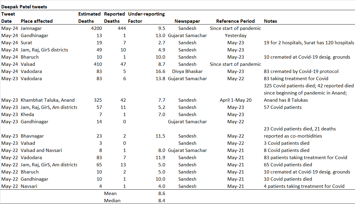 The numbers reported by @Divya_Bhaskar are in tune with the daily updates given by @deepakpatel_91, scanning the local press on Covid patients dying but not counted as Covid-dead. This is just a snapshot summary table from his Twitter posts for 3 days in the past week.