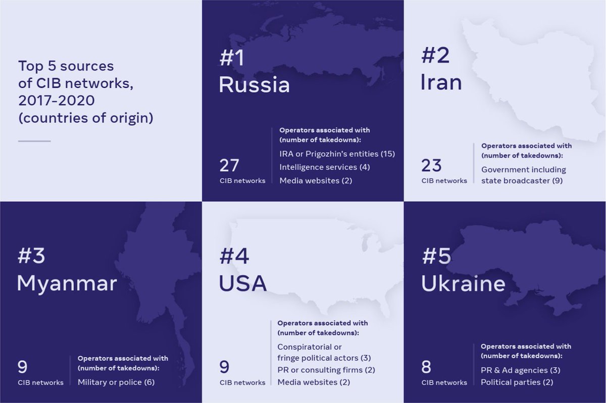 3/ We’ve reported on every CIB takedown since the advent of the CIB policy in 2017, but those reports tend to focus on the individual operations’ behavior and attribution. We felt it was important to also provide a strategic look at the ecosystem of IO uncovered between 2017-2020