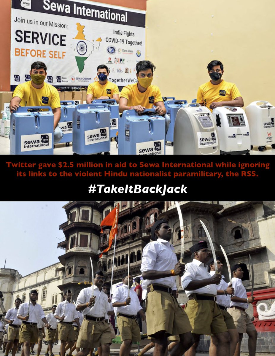 Twitter gave $2.5 million in aid to Sewa International while ignoring its links to the violent Hindu nationalist paramilitary, the RSS. #TakeItBackJack