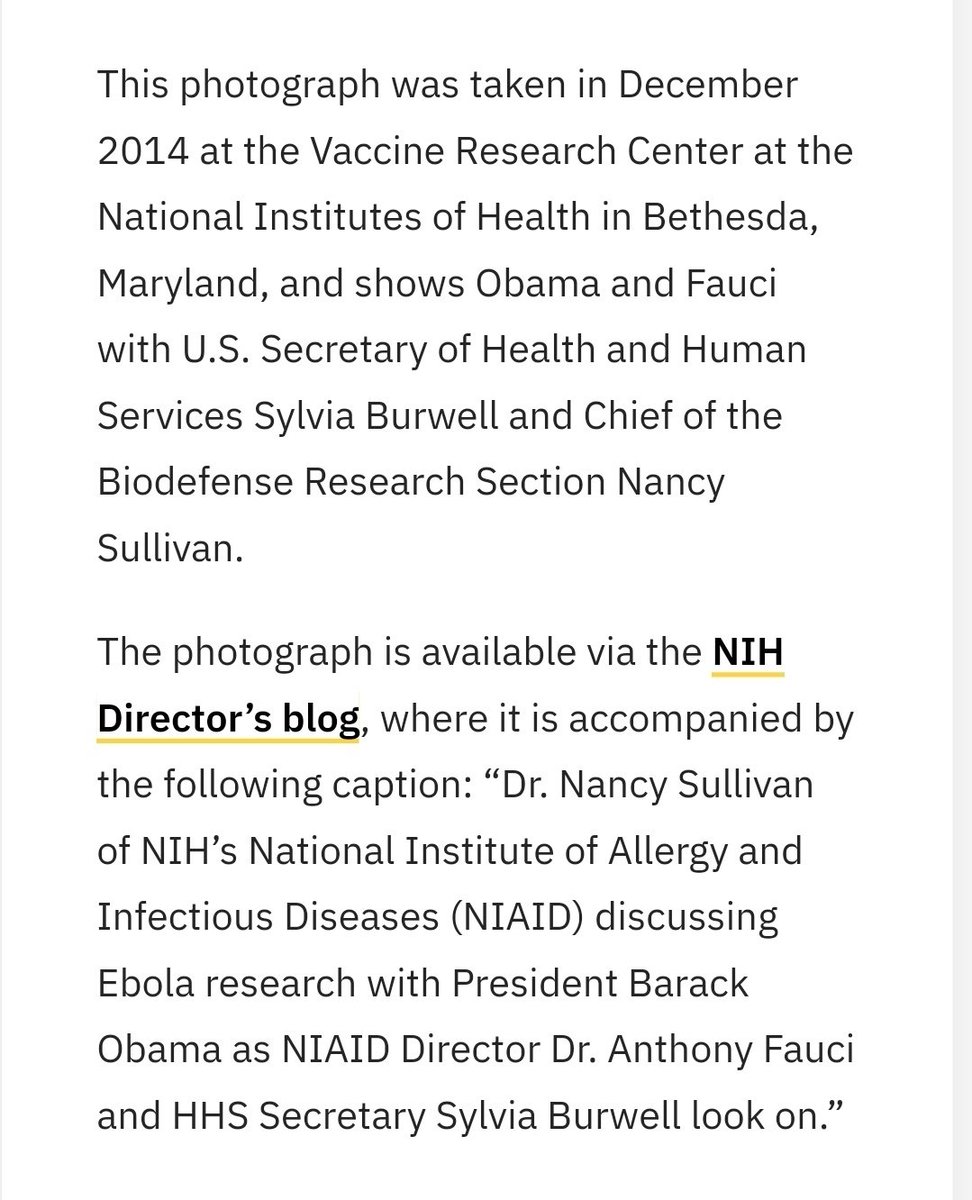 "This photograph [Dec 2014, at the Vaccine Research Center, MD] shows Obama and Fauci with U.S. Secretary of Health and Human Services Sylvia Burwell and Chief of the Biodefense Research Section[,] Nancy Sullivan."