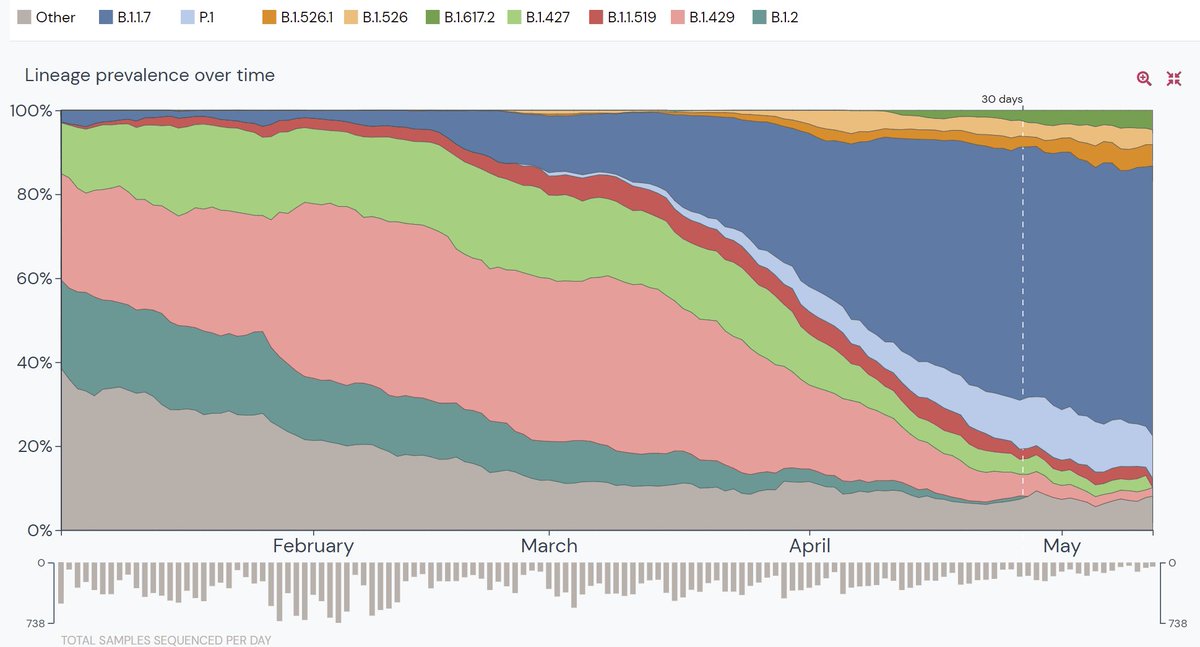 Here's CA. A little different. B.1.1.7 is still increasing in frequency (increasing in N CA now; earlier spread in S CA). As elsewhere, P.1 increasing. B.1.526 stable or slightly increasing. B.1.427, B.1.429 being displaced. B.1.617.2 increasing.