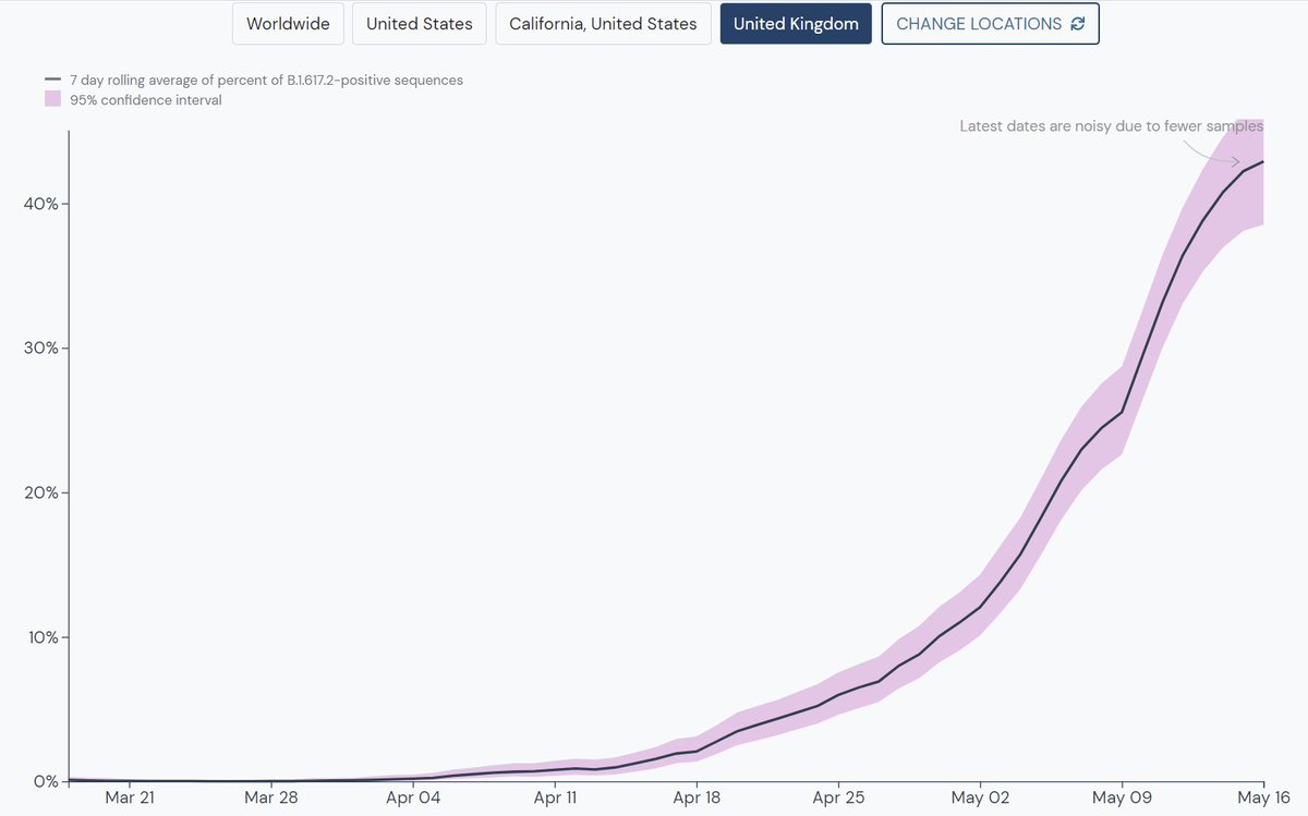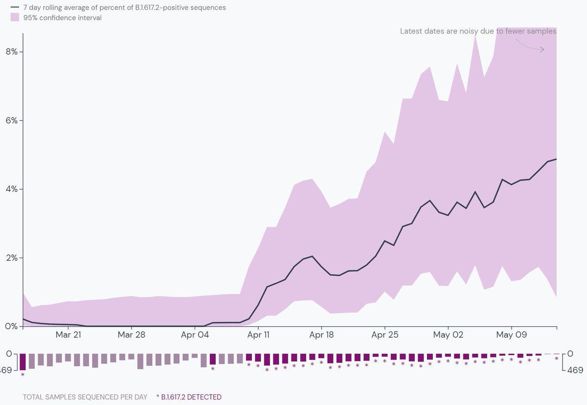 In UK B.1.617.2 is displacing B.1.1.7 (follow @chrischirp@arambaut for 2 perspectives on rise), likely due to increased transmissibility & partial immune escape, especially for 1-dose vaccine protection. How this will play out in US w/ most receiving both doses is unclear to me.