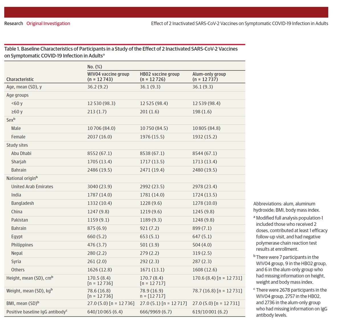 3. En el anรกlisis principal (Modified full analysis population-1) consideraron 12743 en brazo Wuhan, 12726 en el brazo Beijing y 12737 en el brazo placebo. Sin diferencias estadรญsticas a nivel basal entre los grupos para las variables medidas.