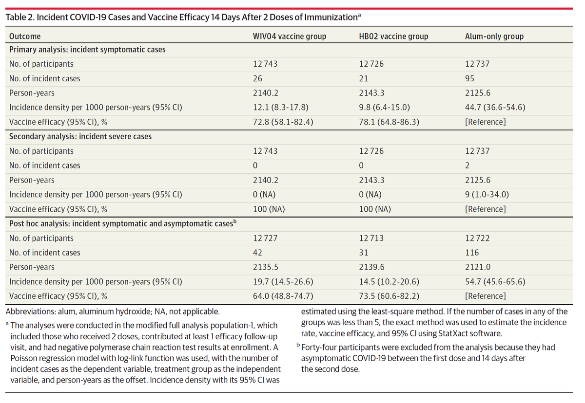 4. El desenlace principal fue enfermedad COVID19 sintomรกtica, la eficacia se estimรณ a partir de la densidad de incidencia en cada grupo vacuna frente a placebo. La eficacia fue 78,1% (IC95%: 64,8%-86,3%) en la vacuna Beijing y 72,8%(IC95%: 58,1%-82,4%) en la vacuna Wuhan.