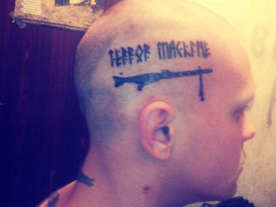 A bit about his tattoos (not the more obvious ones). The two hand grenades is the insignia of the Dirlewanger Brigade ("36. Waffen-Grenadier-Division der SS"), a unit that was recruited from criminals and notorious for its atrocities all across Nazi-occupied Eastern Europe.