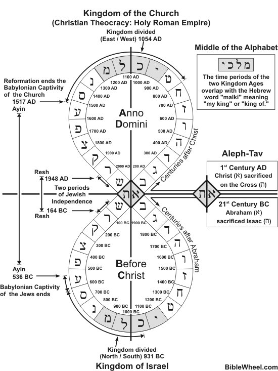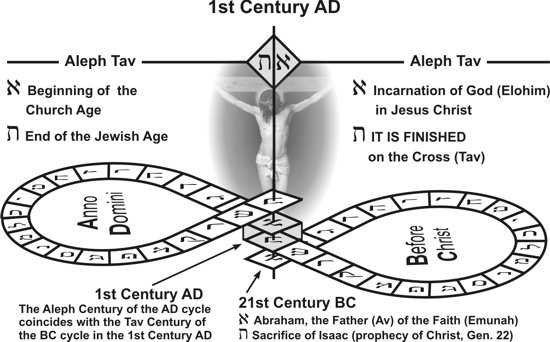 The image displays the two great interlinked cycles of history. The first cycle (on the bottom) represents the time from Abraham to Christ. It begins with Aleph in the 21st Century BC with the call of Abraham (Aleph KeyWord Avraham) and ends with Tav in the First Century AD ....
