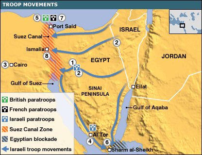 En 1956, Egipto decide nacionalizar el Canal de Suez, porque Reino Unido y Estados Unidos se negaron a la financiación de la construcción de la presa de Asúan. En esta toma del canal, Egipto bloquea la principal entrada al principal puerto de Israel, el Estrecho de Tirán.