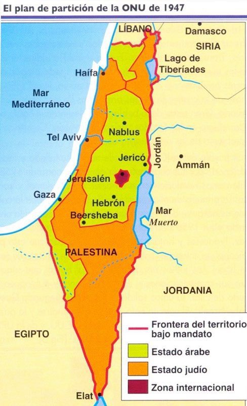 En 1947, la recién creada ONU (reemplazó a la Liga de Las Naciones) aprobó un plan de partición para Israelitas y Palestinos, es decir, dividir el territorio en proporciones iguales, para crear un Estado judío y otro árabe.