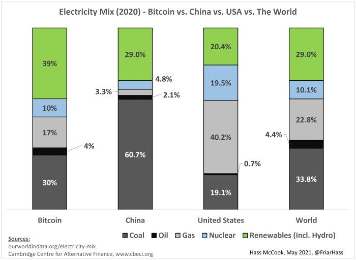 Musk says that they intend to use bitcoin when mining transitions to more sustainable energy. Tesla’s second biggest market, China, has a grid that is 28% renewable, and 64% coal. In the worst case, Bitcoin is 29% renewable, and in the best case, around 73%.