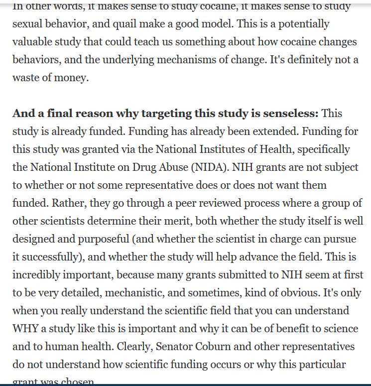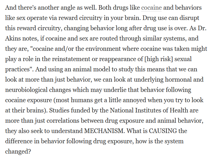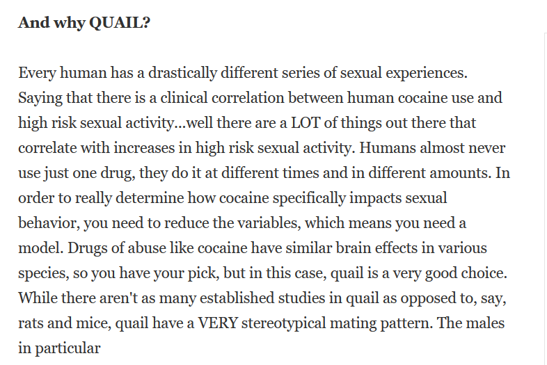 Oh, and that @sciam blog post from 2011 discussed in great detail about why one might want to study the effect of cocaine on quail sexual behavior. Worth a read. 5/end blogs.scientificamerican.com/scicurious-bra…