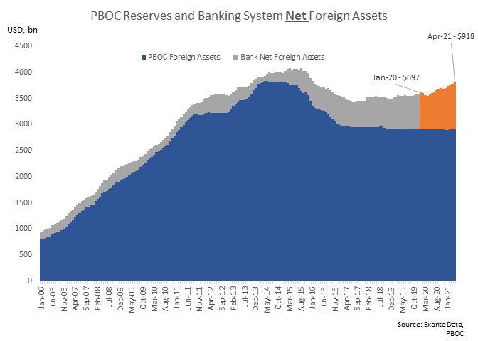 But it's not just the central bank. Chinese state/commercial banks are now behind the biggest portion of FX asset accumulation, with *net* foreign assets up more than $200bn since the start of 2020.