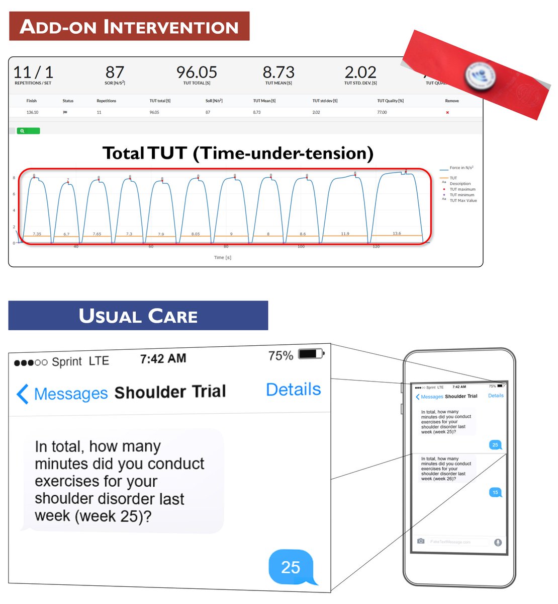 We objectively monitored the actual exercise dose using a sensor mounted on the elastic band and monitored time spent on exercise in usual care through weekly text-messages.