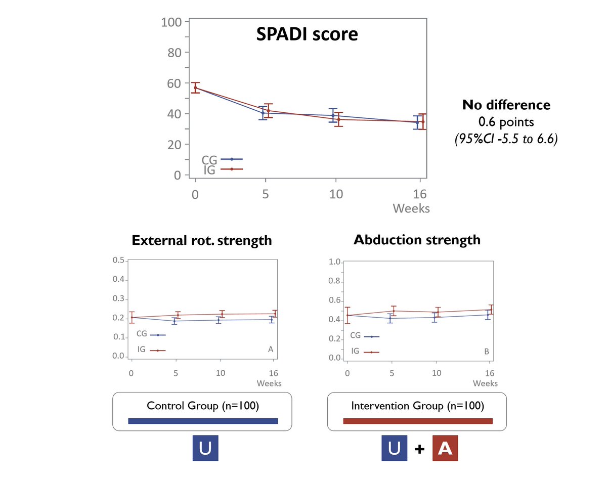 RESULTS: Despite the prescription of a large additional exercise dose, we found NO difference between groups. Not in patient-reported disability (SPADI), nor in strength, ROM or QoL.