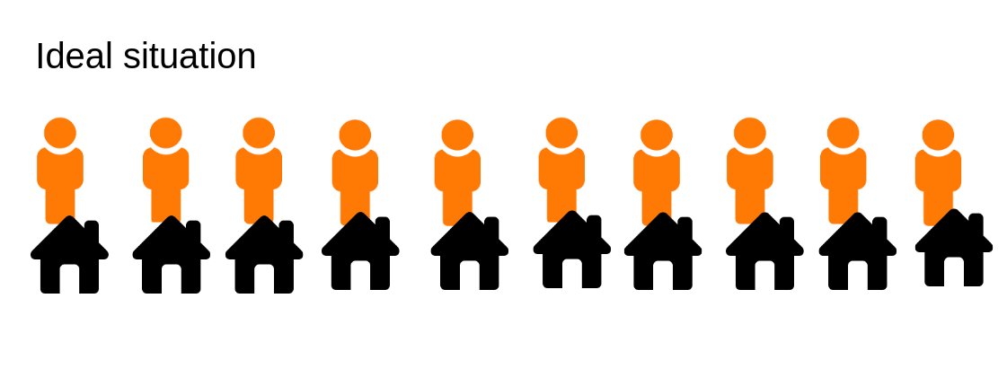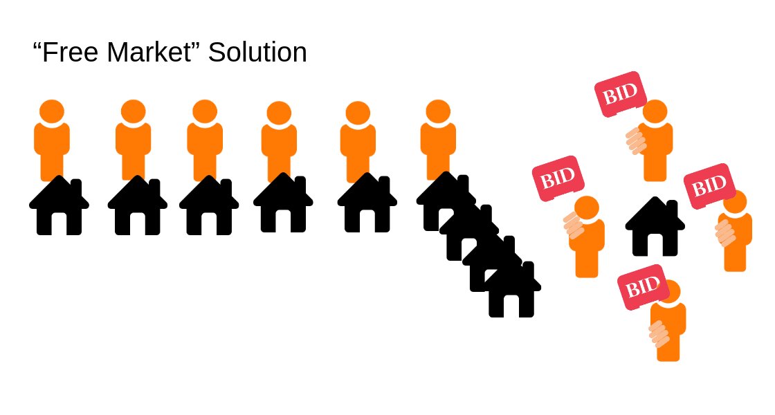 "Free market" solution: 5 people each buy one home. Sixth guy, a realtor, buys four. Now you have 4 people trying to outbid each other for the last remaining home. Prices escalate.