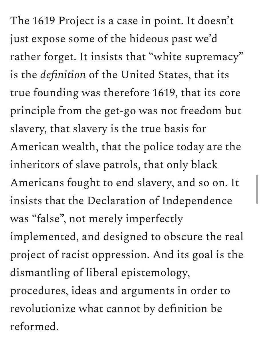 I am pretty sure the 1619 Project did NOT insist that “white supremacy” was the *definition* of the US. If that were the case, there would be no point trying to educate the next generation about our racist history in hopes that they might be able to overthrow US white supremacy.