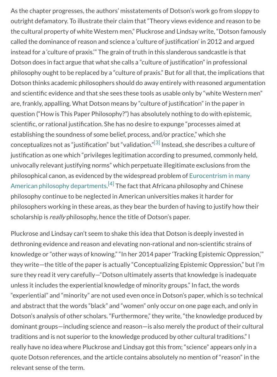 This is especially revealing when one considers the fact that “the Dotson portion” of my review is without question the most damning of Pluckrose and Lindsay’s scholarly ineptitude. It’s important for Jimmy to sweep this under the rug!