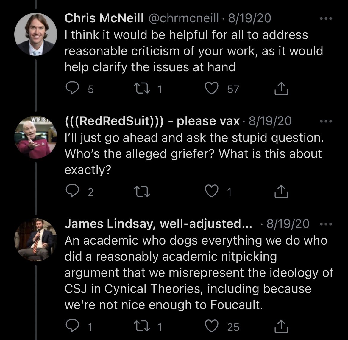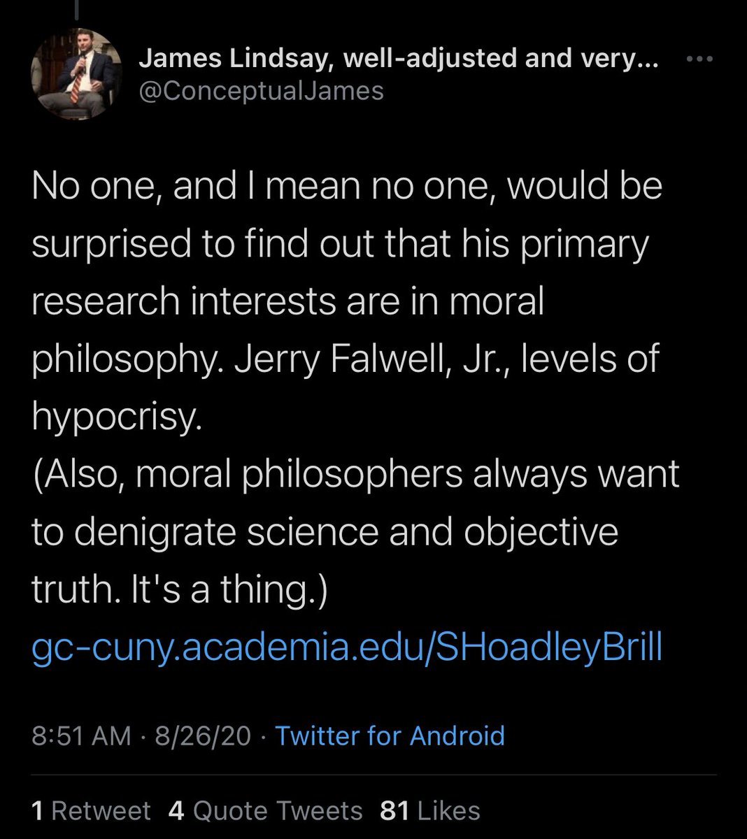 This is one of my favorite parts of the saga. James goes fucking HAM with the scare quotes, baby. He links my academia.edu page (😂) and makes accusations of hypocrisy while exemplifying hypocrisy par excellence!