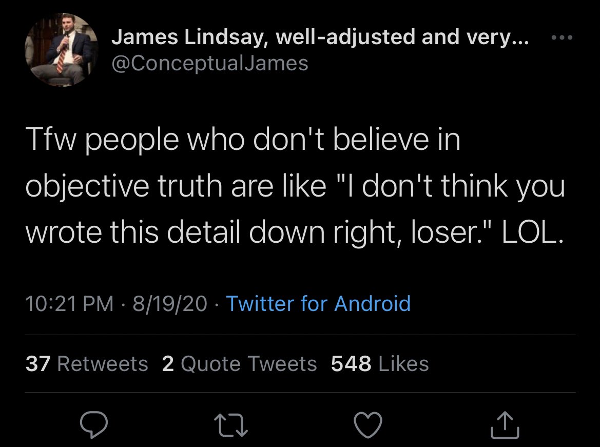 James subtweets me, again claiming I don’t believe in objective truth! Very strange behavior, unless you’re looking to do whatever it takes to distract your fans from your own cowardice. The next day he butchers the notion of epistemic oppression, capitalizing on another excuse.