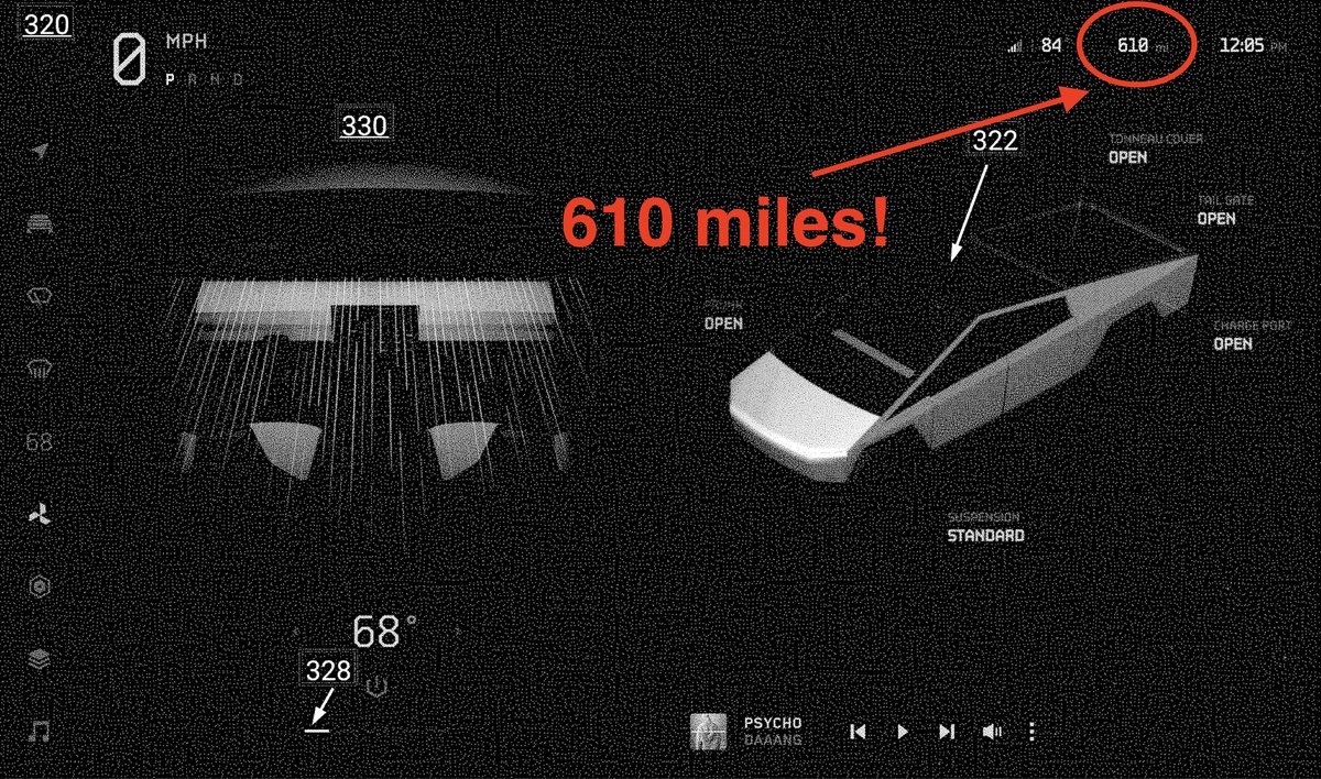 Patent application drawings show Cybertruck with 610 mile range. Obviously this is no guarantee, but nevertheless interesting. (Tri-motor Cybertruck is advertised with 500+ mile range on Tesla's website)