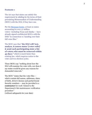 The DOJ has asked states to agree to sign a secret agreement “in connection w/ handing over their full voter files.” The agreement says that “the DOJ will ‘test, analyze, & assess states’ [voter rolls]’ & send each participating state a list of voters who must be removed within 45 days.” 2/5/26 1/