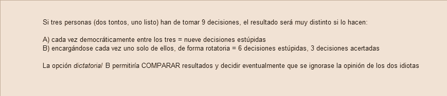 Si la población es ymbЁcyl, las decisiones adoptadas por mayoría en cualquier grupo (desde un tribunal hasta el electorado en las urnas) serán casi siempre subóptimas o disparatadas.