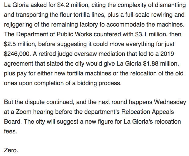 But now, the 3 Behar daughters who now run La Gloria are fighting to keep their business alive. The issue? The City of LA acquired their flour tortilla plant via eminent domain years ago. The two sides then tried to settle on an amount for relocation fees. Then...