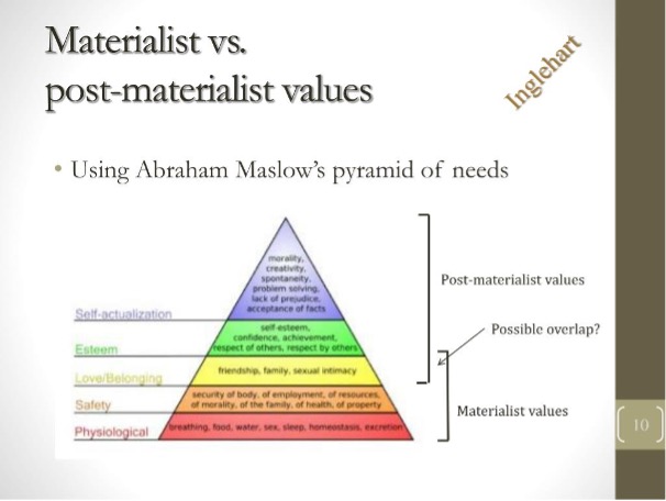 Inglehart, artan refahla birlikte, bu tür postmateryal değerlerin, nesiller arası değişim yoluyla gelişmiş endüstriyel toplumlar kademeli olarak artacağını savundu.