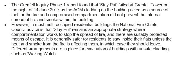 But the government seems to be reinterpretting the Grenfell Inquiry as saying, essentially, that stay put is ok unless there is dangerous cladding on a building. Here's the latest Home Office line: