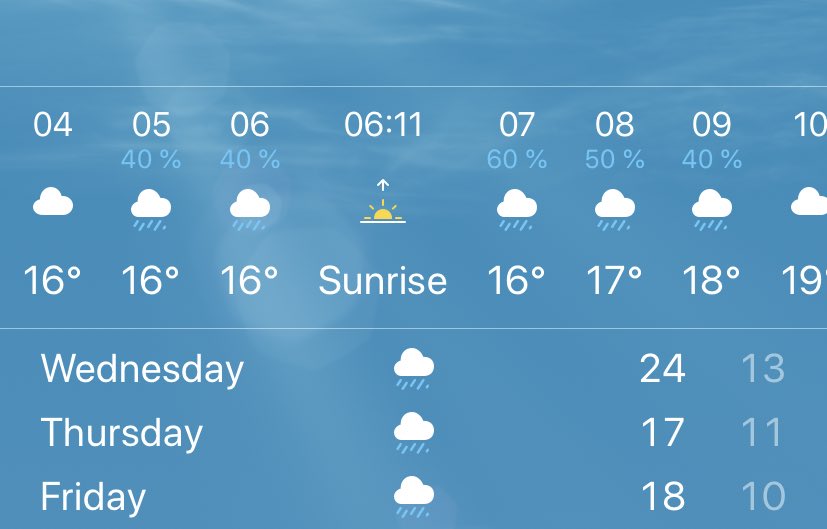 I have a live example here in Bretagne which is about to play out in real time. This is what my phone says. Rain is coming in 8 hours time. Lowish probability and only lasts four hours.