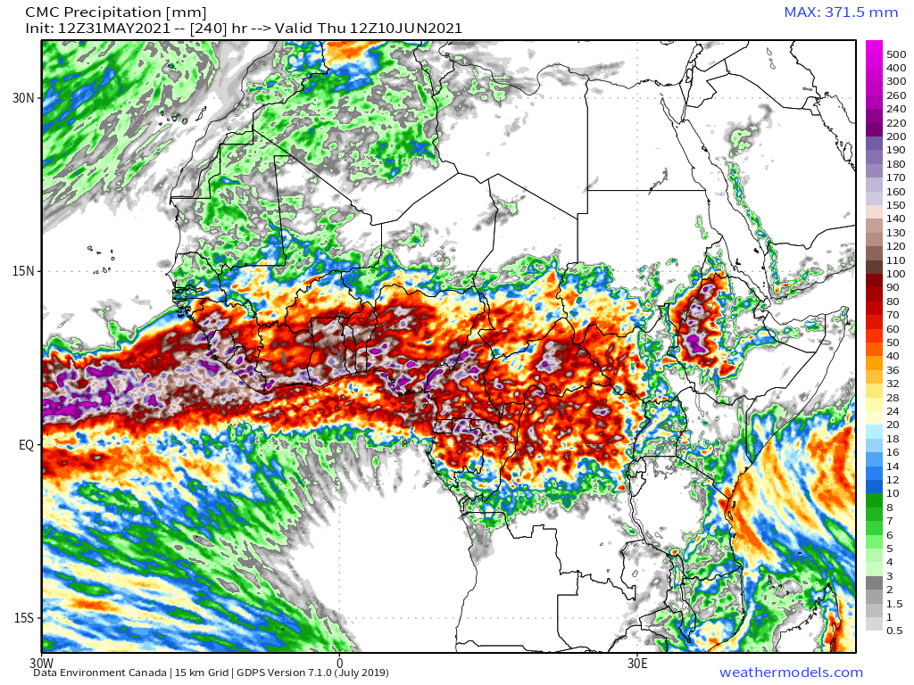 1 June 10-day rain (+ 12 day KMA) forecasts for the #HornOfAfrica. The intensity of rain in the 12 day KMA forecast looks like what the Blue Nile historically delivers.