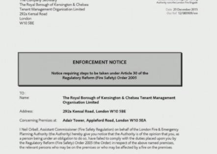 Asked about the programme of fire risk assessments in the borough, she was shown an enforcement notice issued to Adair Tower after a fire in 2015, which noted (among other things) missing self closers on front doors. Was she surprised by this?