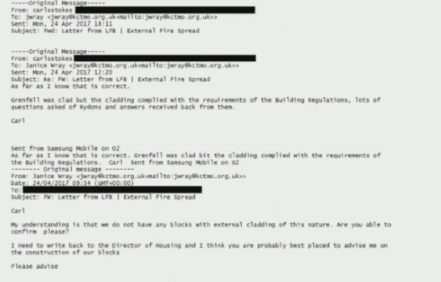 A week later, the head of health and safety at the TMO asks him to comment - saying she does not think they have blocks 'with external cladding of this nature'.