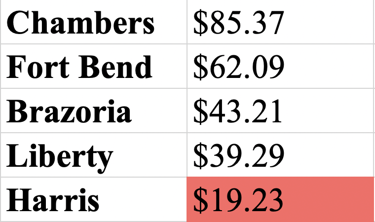 Money disproportionately flowed to smaller TX counties at the expense of large ones, regardless of damage sustained during Harvey.