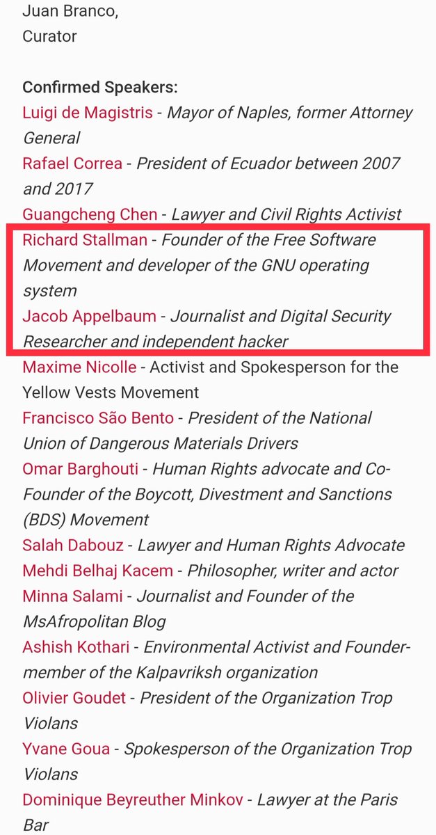Richard Stallman et Jacob Abbelpaum ont défrayées la chronique dans des affaires criminelles d’ordre sexuelles. En ce qui concerne Richard Stallman, son nom apparaît dans deux des nombreux épisodes de l’Affaire Epstein (via Marvin Minsky). Merci @PhilipdDaFourth 🙏