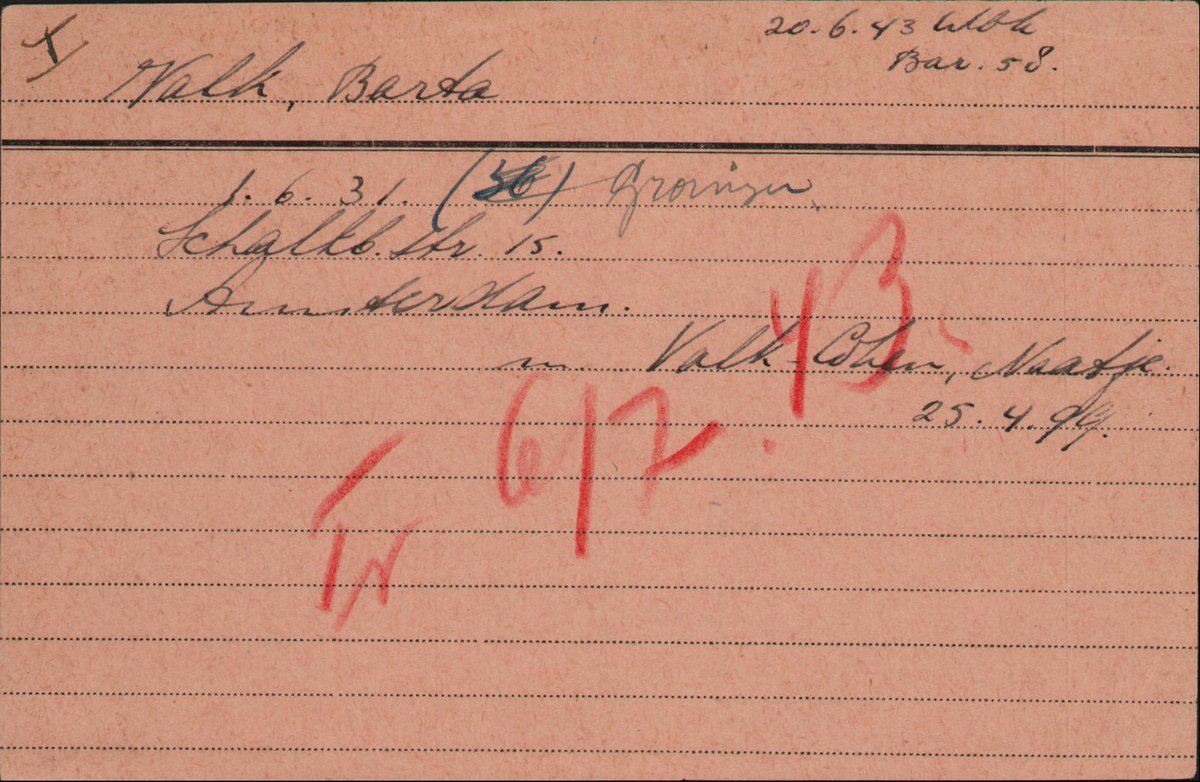 (4/8) With loudspeaker cars the Jewish population was driven to the meeting points. The personal data were processed by the administration that came over from Camp Westerbork. The Jewish council card of Bartha, says 20-06-1943 WBK (WBK=Westerbork).