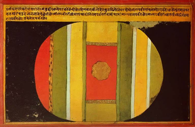 Tantric Cosmic Egg, the fertilized world egg, divided into spheres and currents of energy, Rajasthan, 18th c. Gouache on paper, 27 x 41 cm. Image