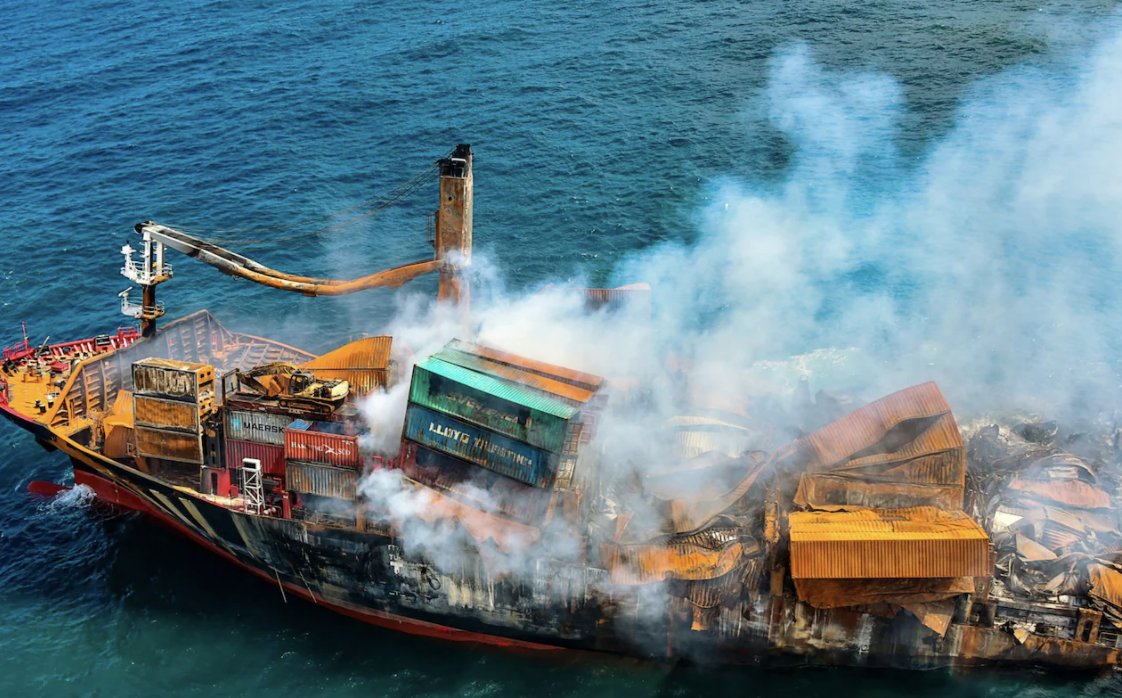 🔥The MV X-Press Pearl, carrying hundreds of containers of chemicals and plastics, burned for 13 days just outside Colombo's harbour.