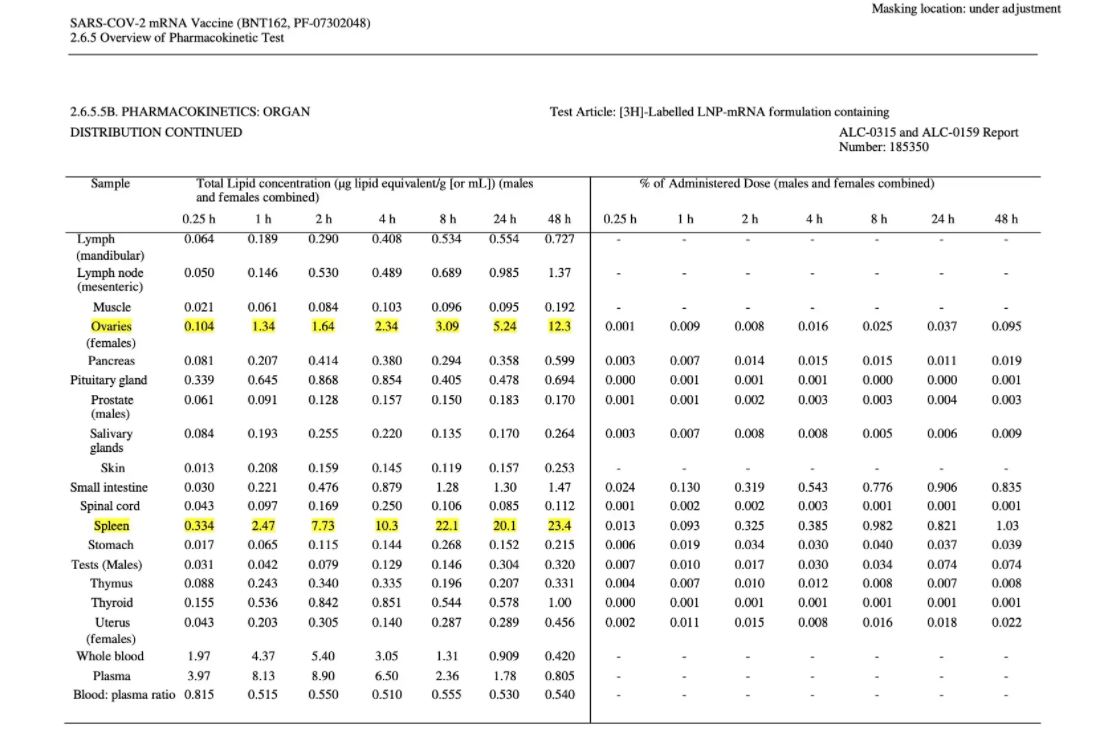 Screenshot von 1 Datenblatt der 🇯🇵 Zulassungsbehörde zum #PfizerBioNTech-#Impfstoff. Dokumentiert wird, wie sich das Spike-Protein in verschiedenen Organen anreichert, wohin es nach Herstellerangaben gar nicht gelangen sollte. Gelb sind Werte für Eierstöcke & Milz hervorgehoben: