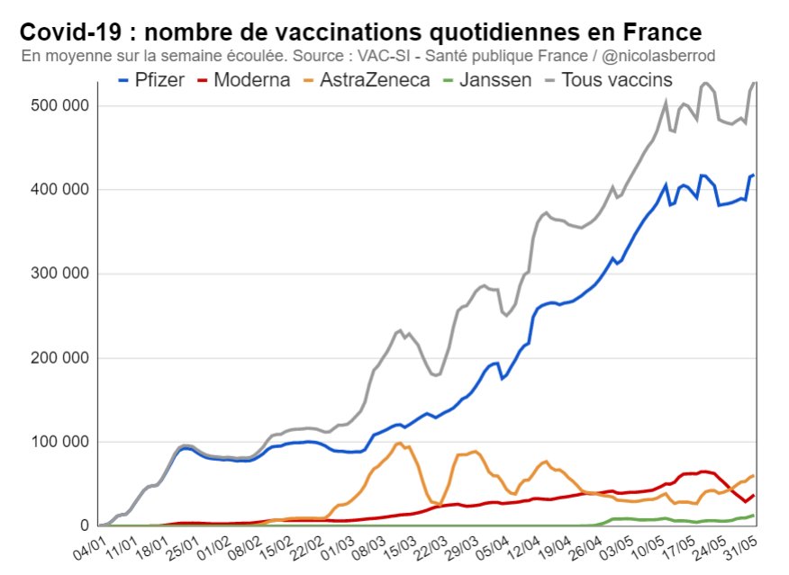 Au moins 621 168 vaccinations ont été réalisées hier, soit 535 000 en moyenne par jour sur la semaine écoulée (nouveau record). 💉 #Covid19 1/