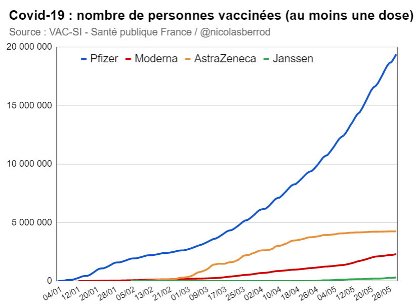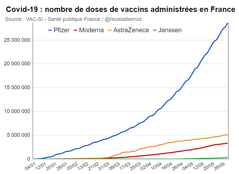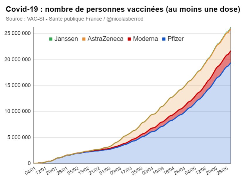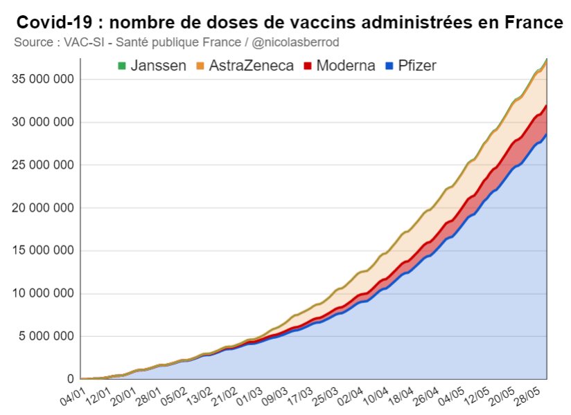 Au 1er juin, près de 38 millions de doses de vaccin ont été administrées au total. Près de 29 millions d'entre elles sont du #Pfizer. Et plus de 26 millions de personnes ont reçu au moins une dose de vaccin. 3/