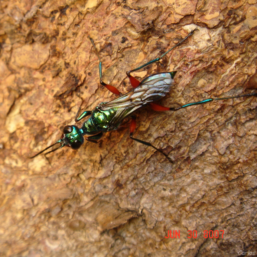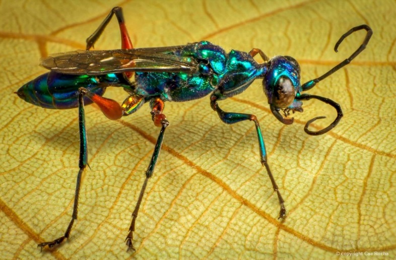 A vespa é a Ampulex compressa, uma parasitoide conhecida no Brasil como vespa-joia, por sua bela cor verde metálico, mas não é nativa do nosso país, veio lá da África.