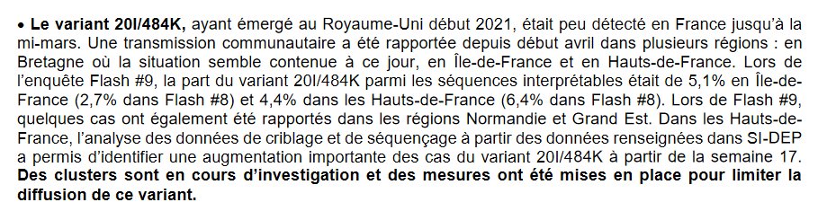 SPF s'inquiète par ailleurs de la propagation du variant 20I/484K, qui s'est notamment propagé dans les Hauts-de-France et dont la proportion dans les enquêtes Flash a nettement augmenté. 7/